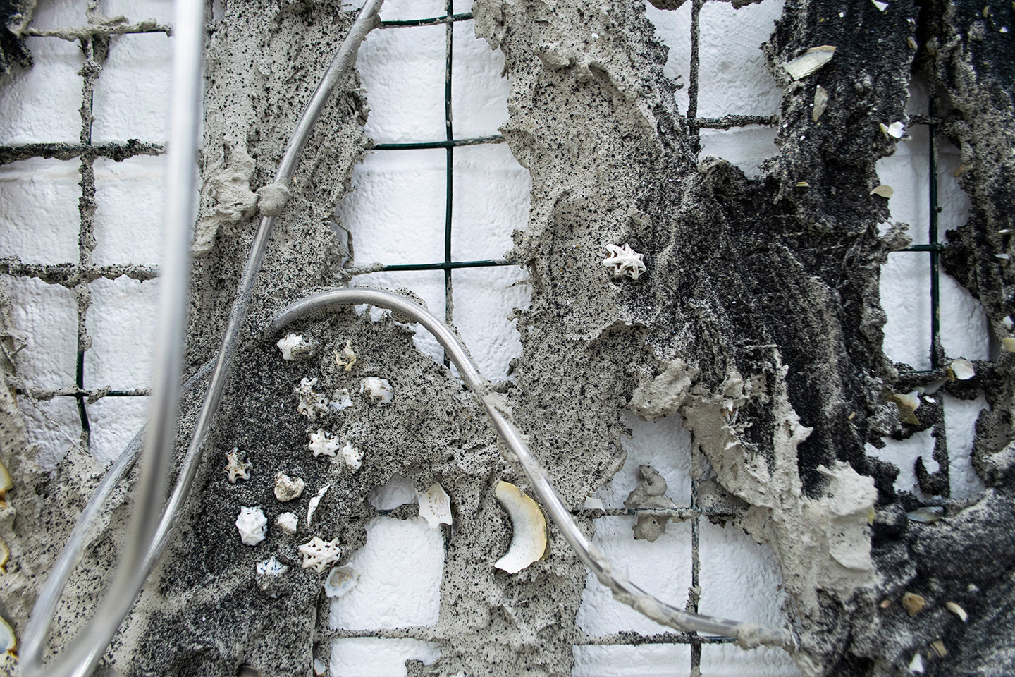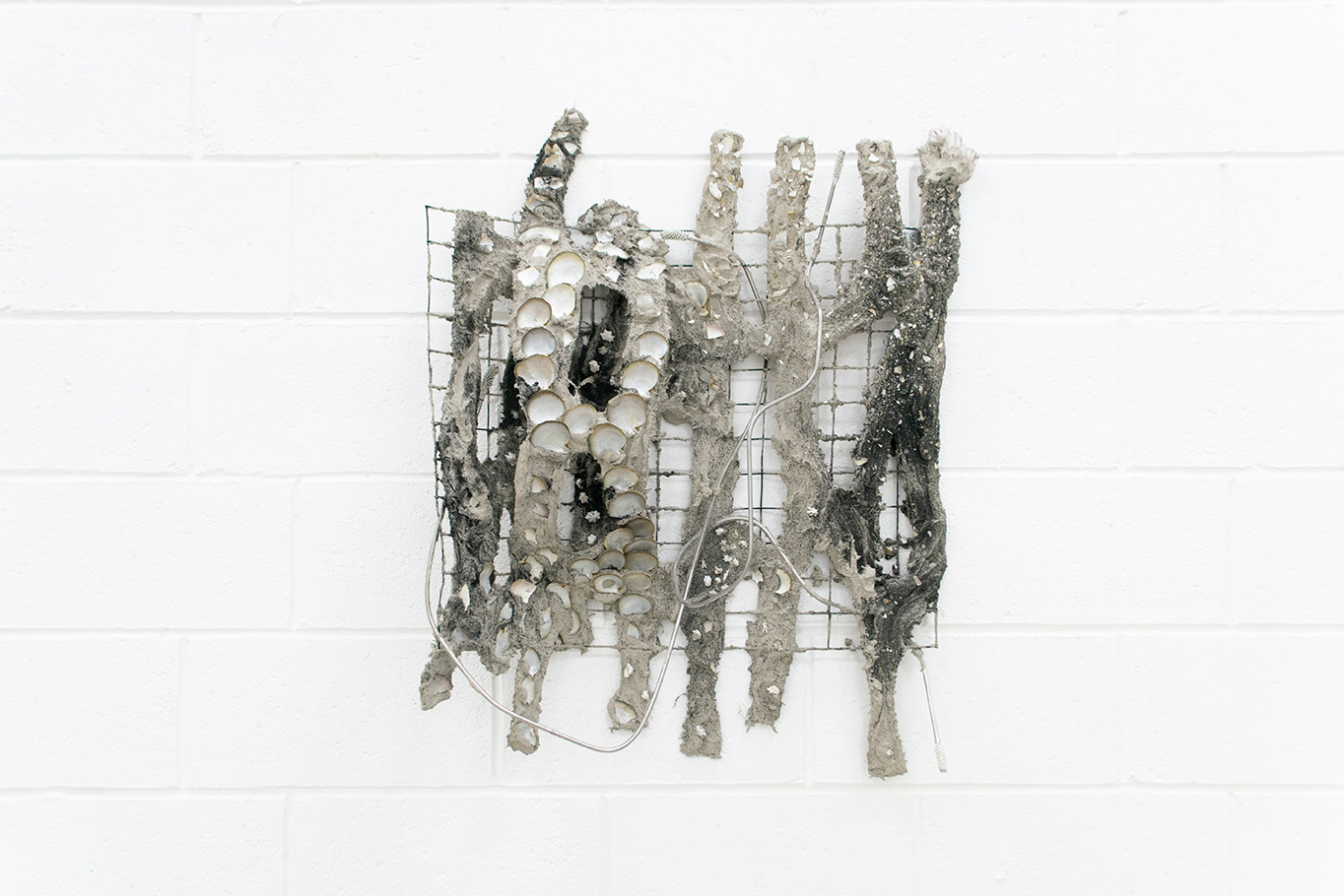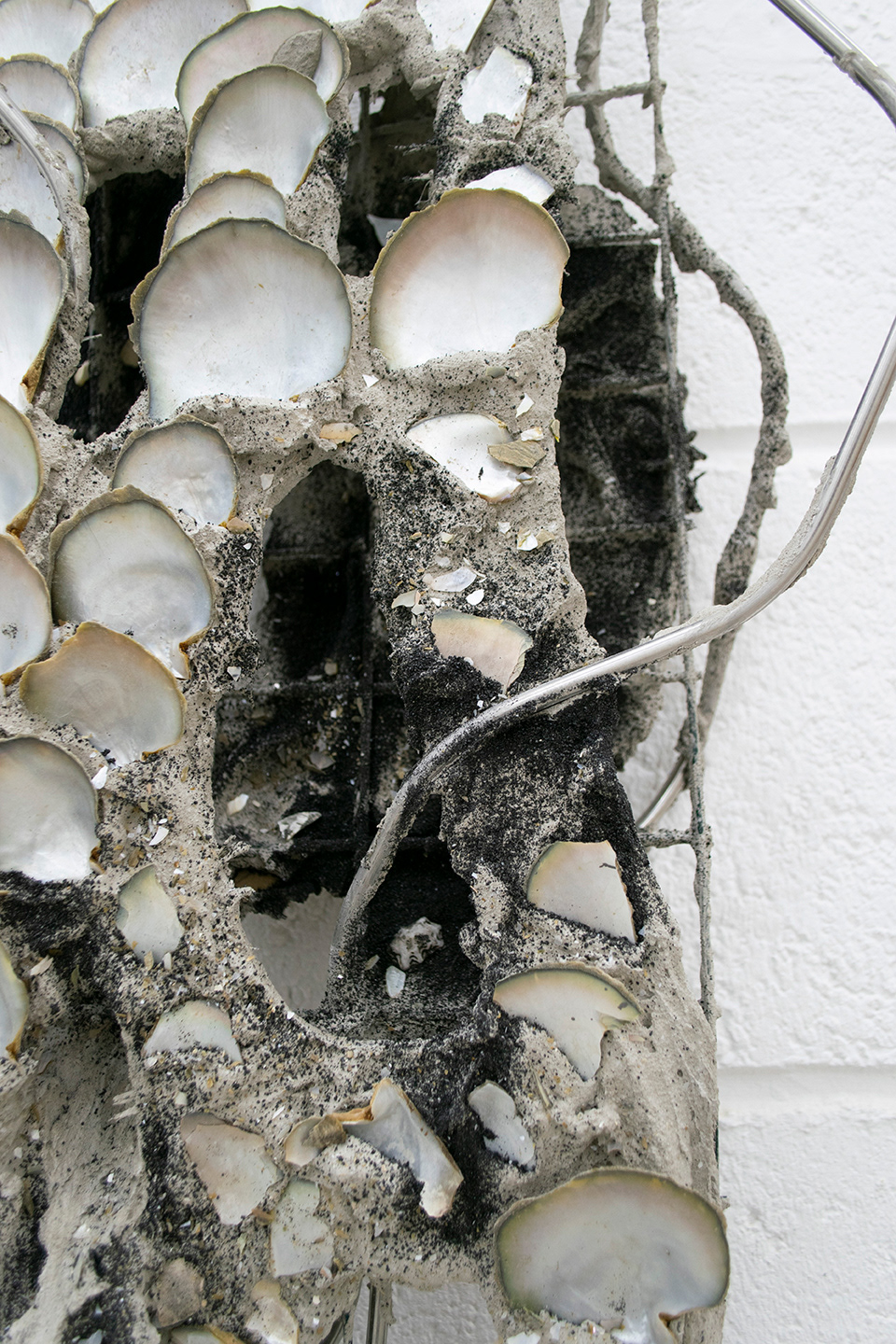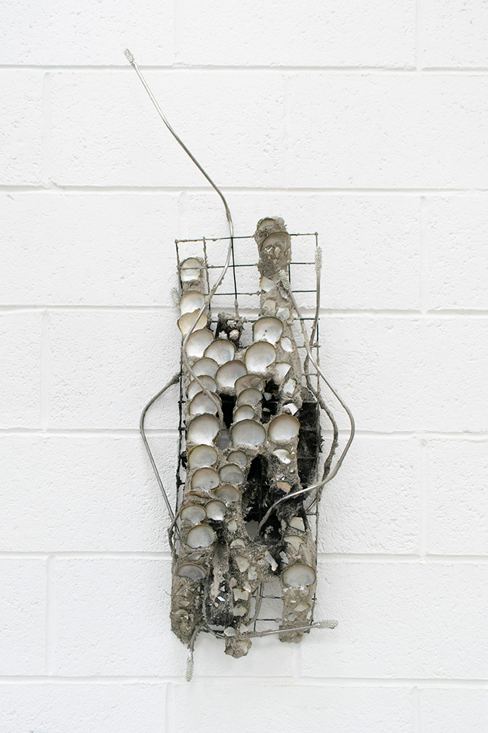 Wire, stainless steel, pewter, hardboard, shells, cement, black sand