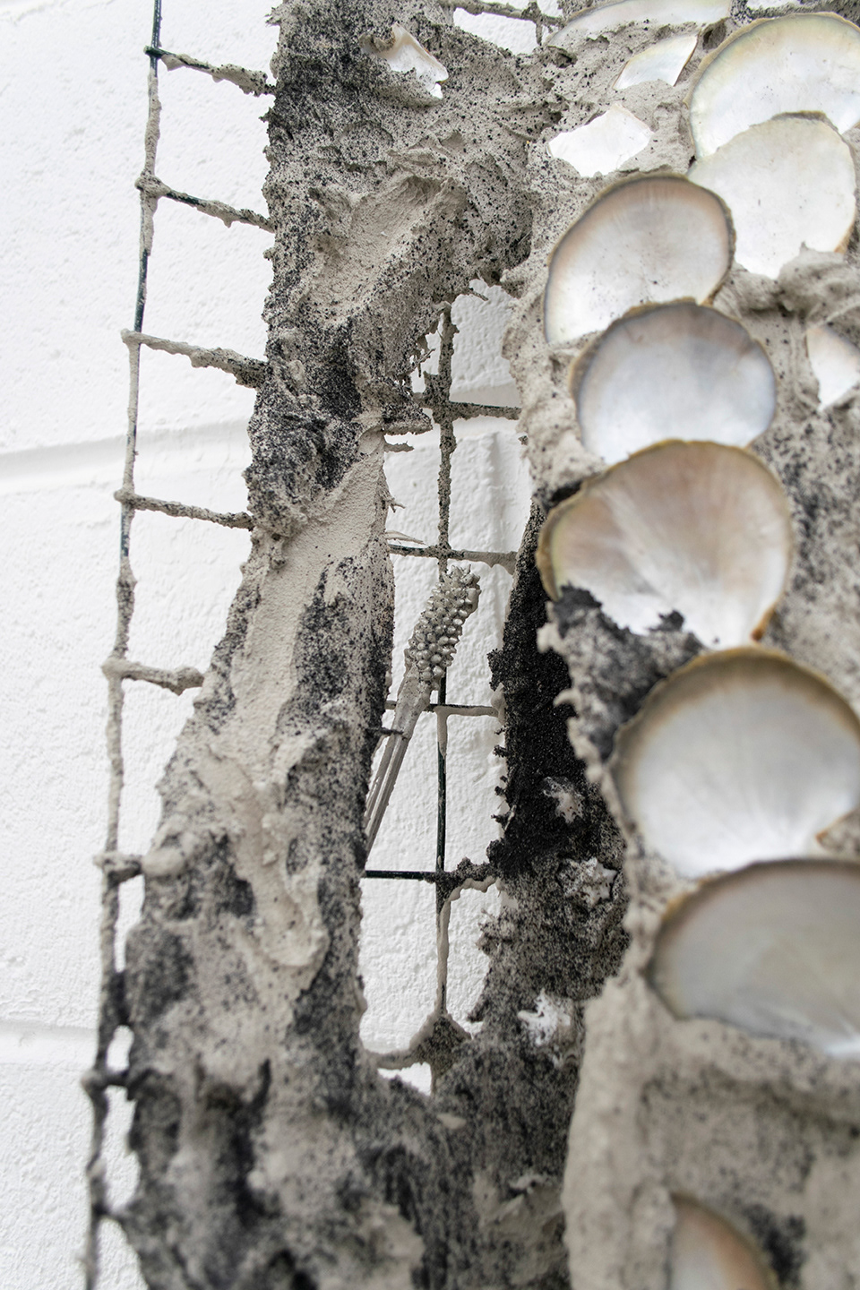 2021 Wire, stainless steel, pewter, hardboard, shells, cement, black sand 98 x 74 x 20cm