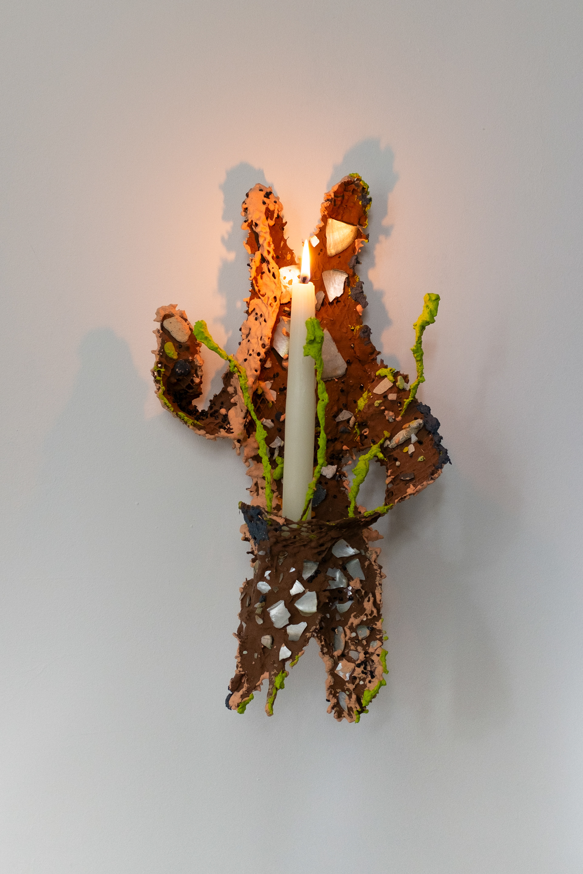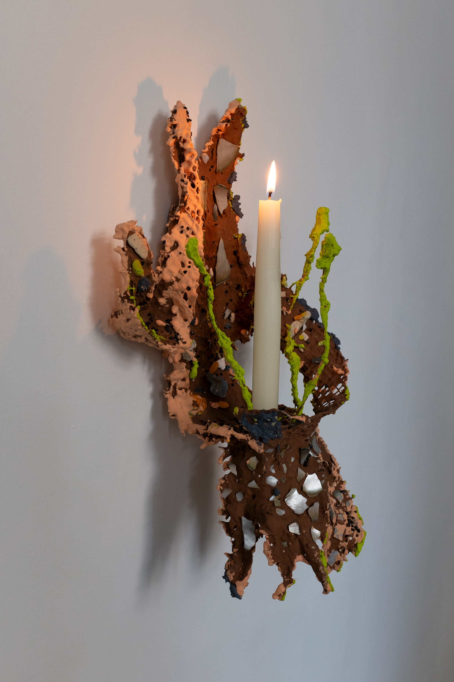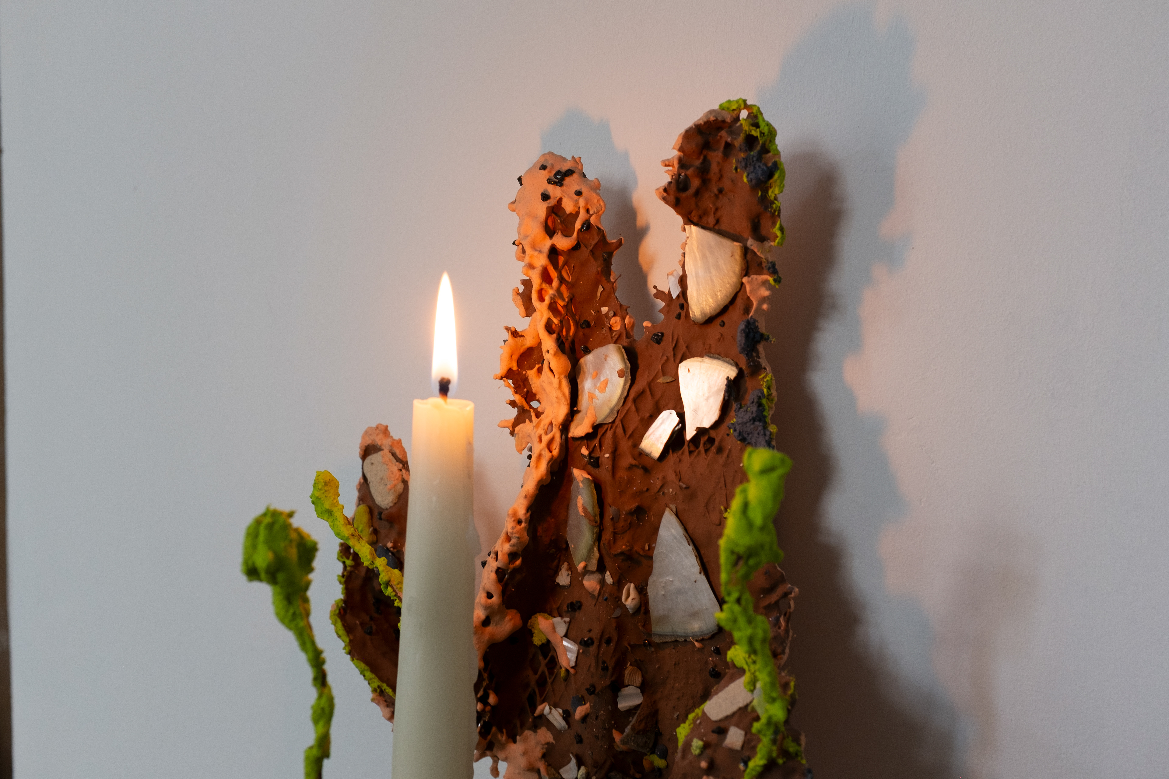 2024 Jesmonite, pigment, metal, wood, oyster shell, sand, volcanic sand, candle 41 x 22 x 18