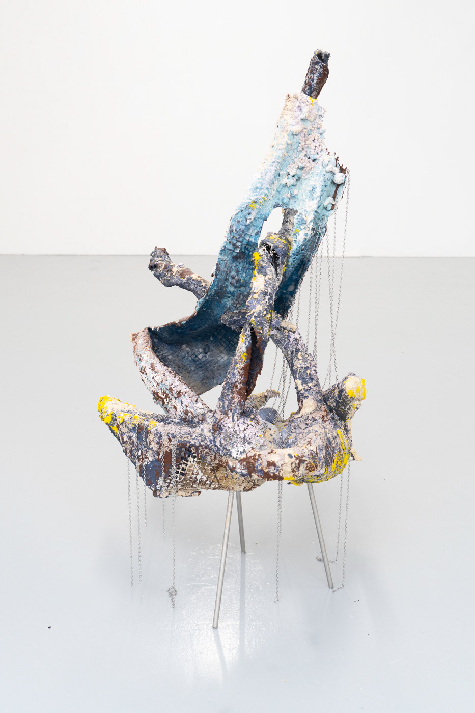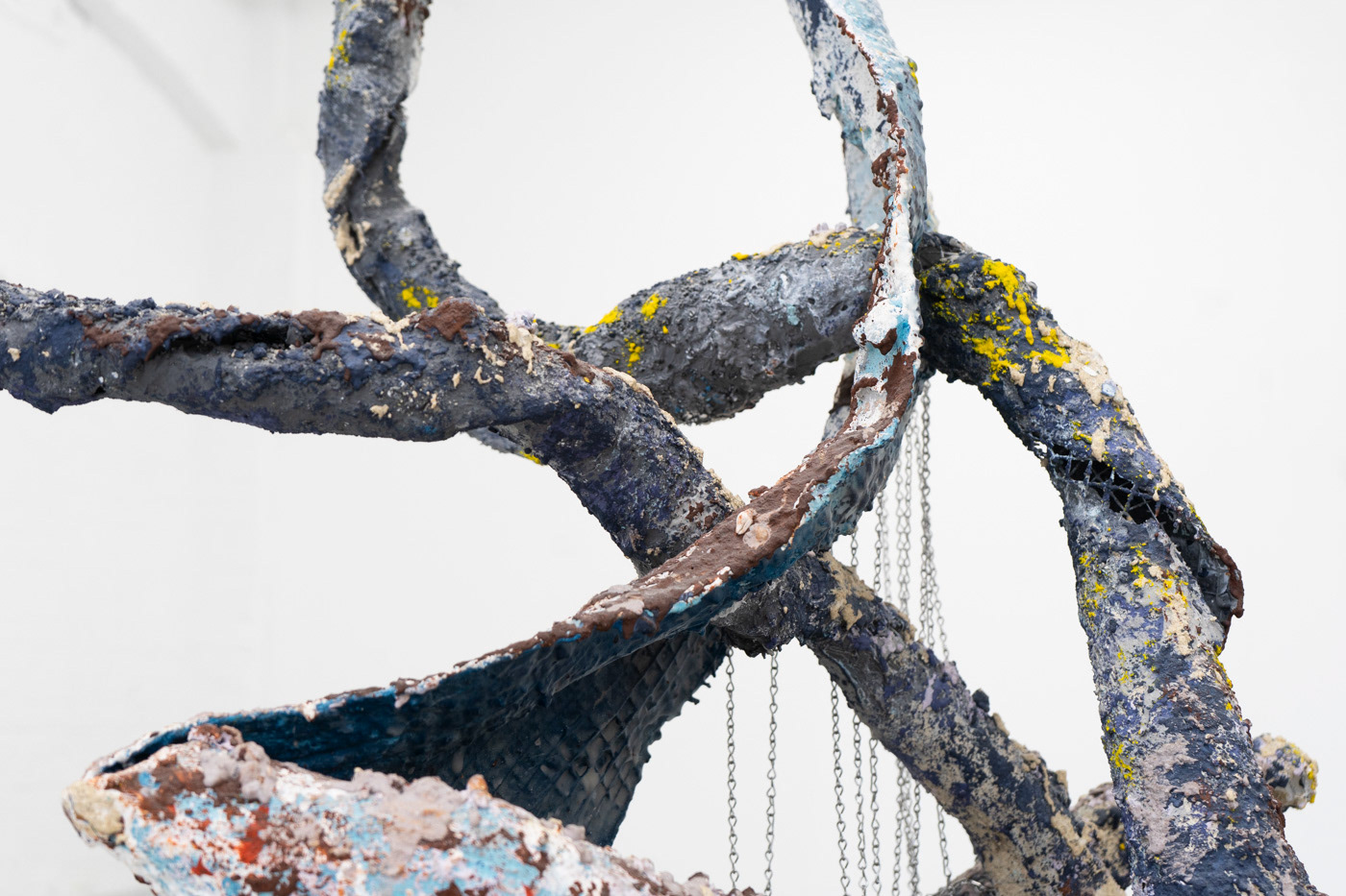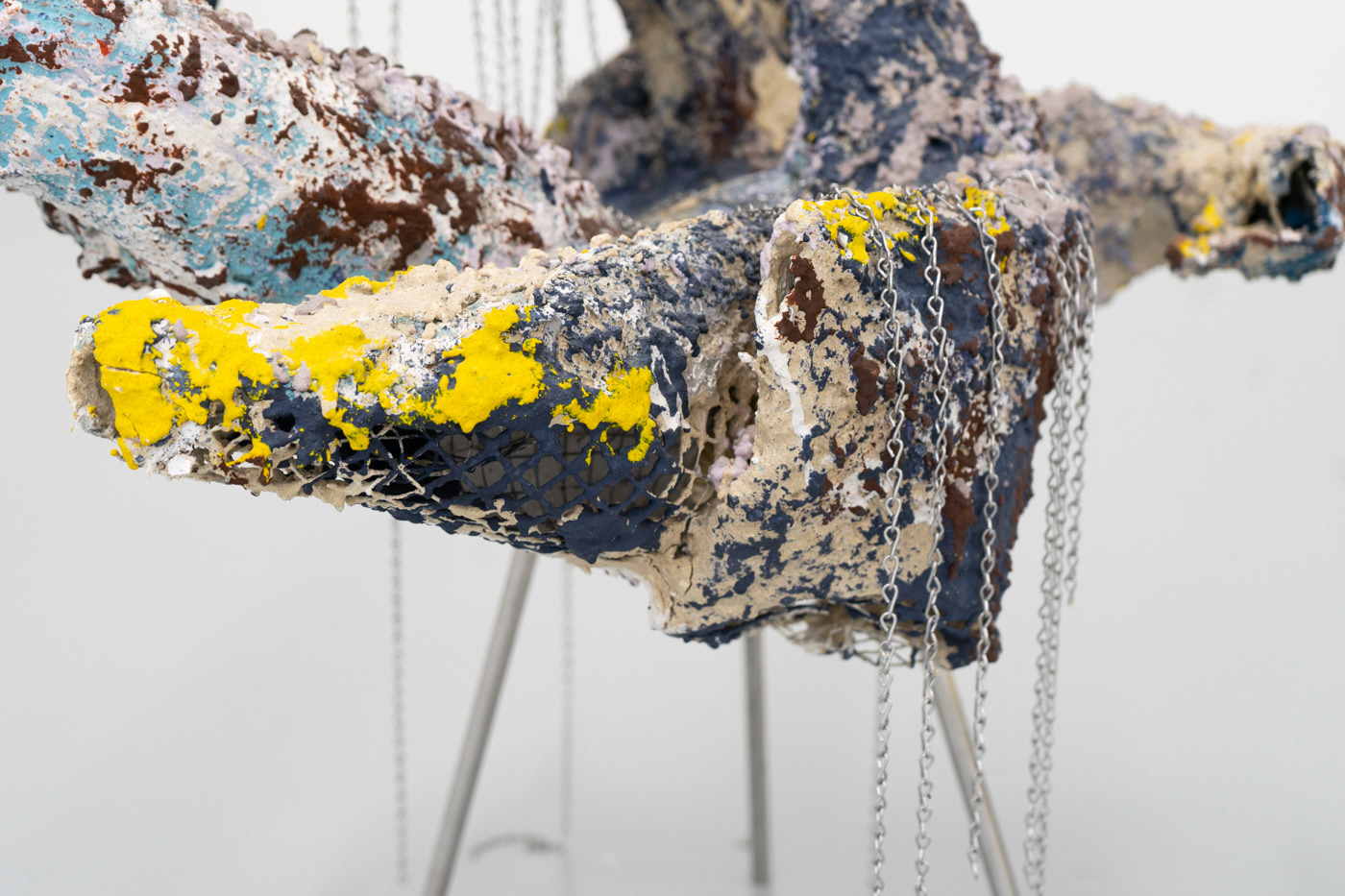 2023 Salvaged extruded plastic, mesh, plaster, Jesmonite, pigment, volcanic rock, sharp sand, ballast, stainless steel rod, stainless steel chain. 110 x 70 x 60cm
