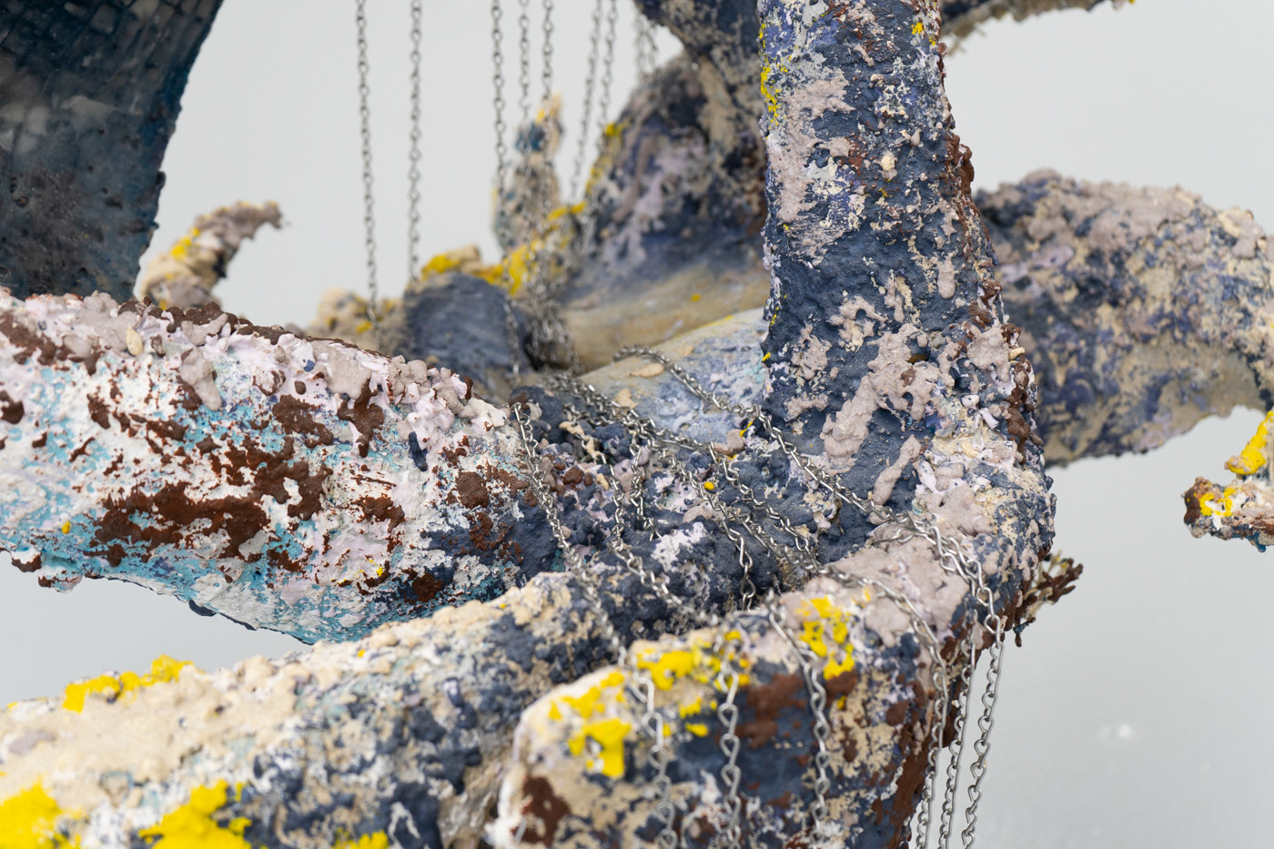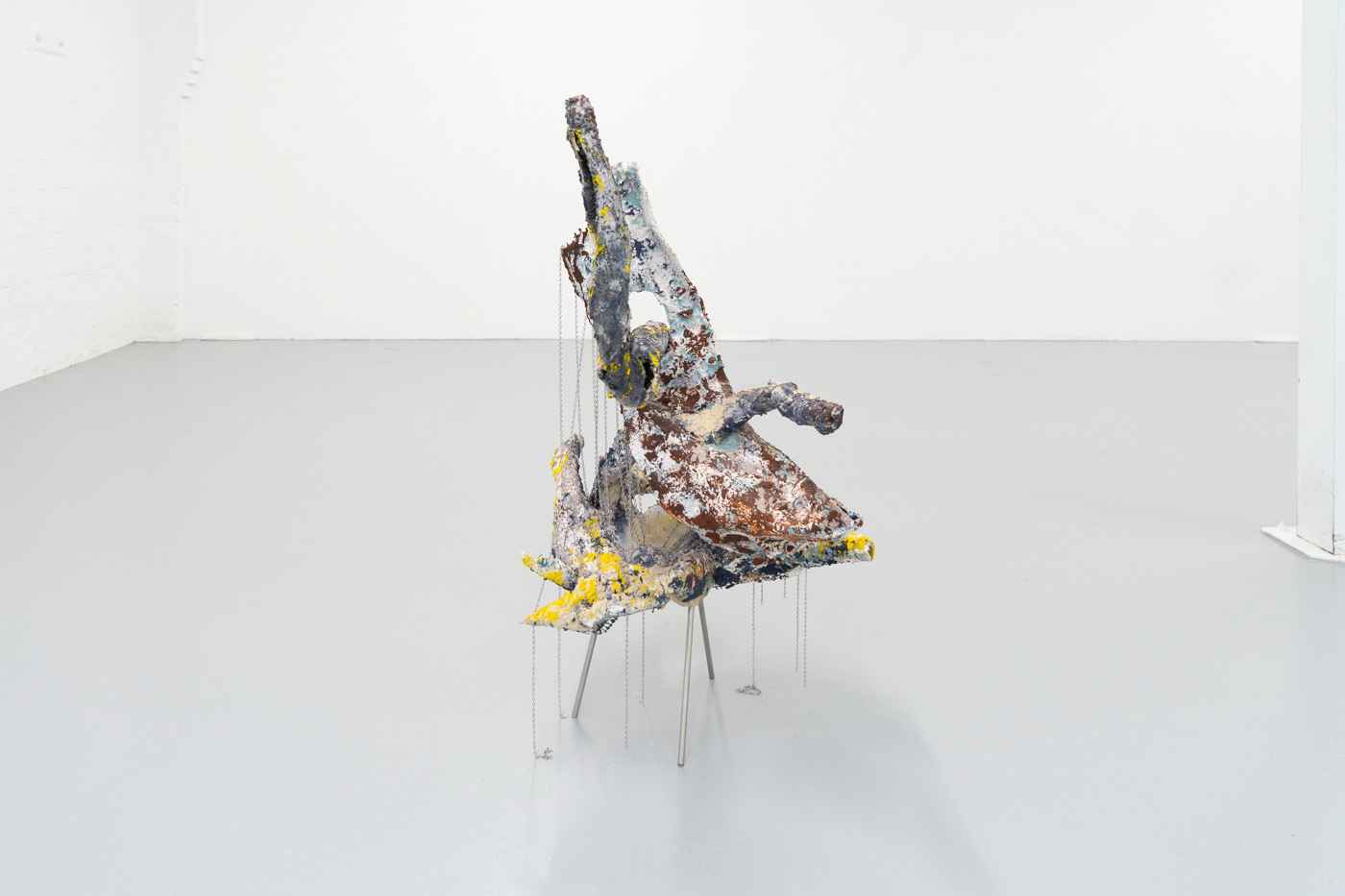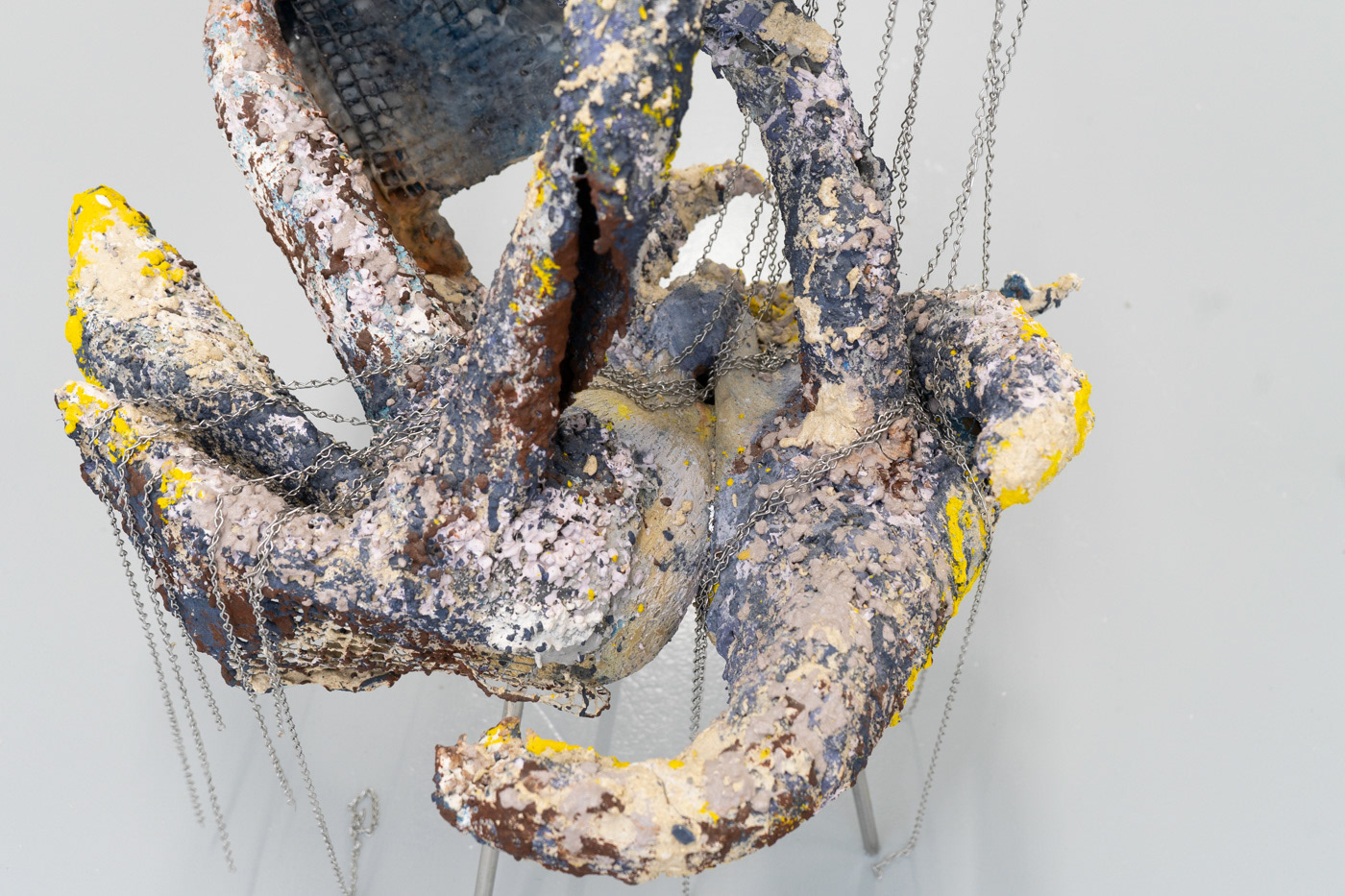 2023 Salvaged extruded plastic, mesh, plaster, Jesmonite, pigment, volcanic rock, sharp sand, ballast, stainless steel rod, stainless steel chain. 110 x 70 x 60cm